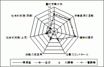 量的労働負荷・労働負荷の変動・精神的要求については標準値に比較してストレス尺度得点が高く、仕事のコントロール・技能の低活用・社会的支援(上司)・社会的支援(同僚)については低い結果であった。